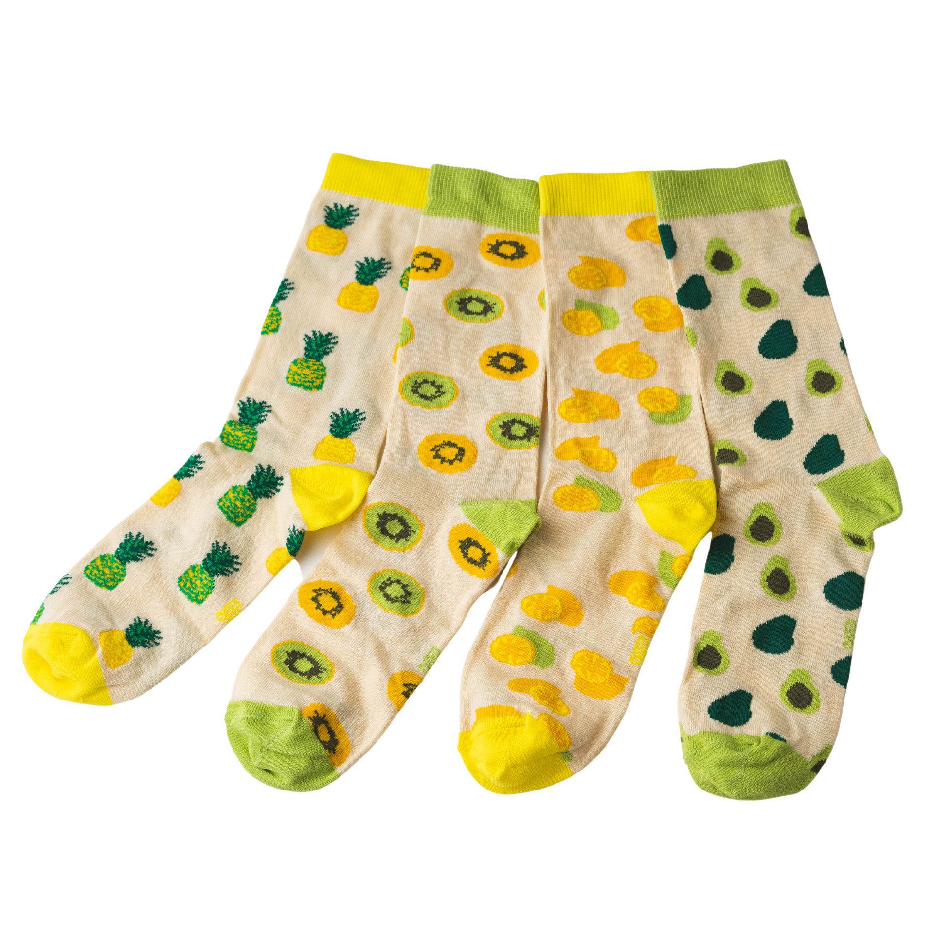 Calcetines de Fruta: con este pack de 4 calcetines, diferentes y combinables entre sí, podrás combinar tus piezas de fruta favoritas, cómo los kiwis, los aguacates, los limones y las piñas.