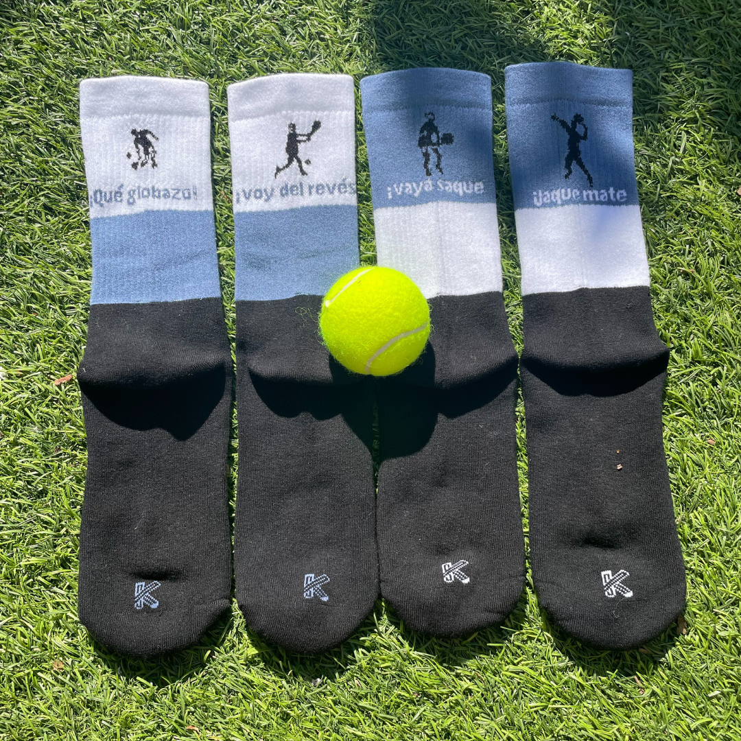 Calcetines de Pádel: con este pack de 4 calcetines, diferentes y combinables entre sí, podrás combinar diferentes frases usadas en la práctica del pádel.